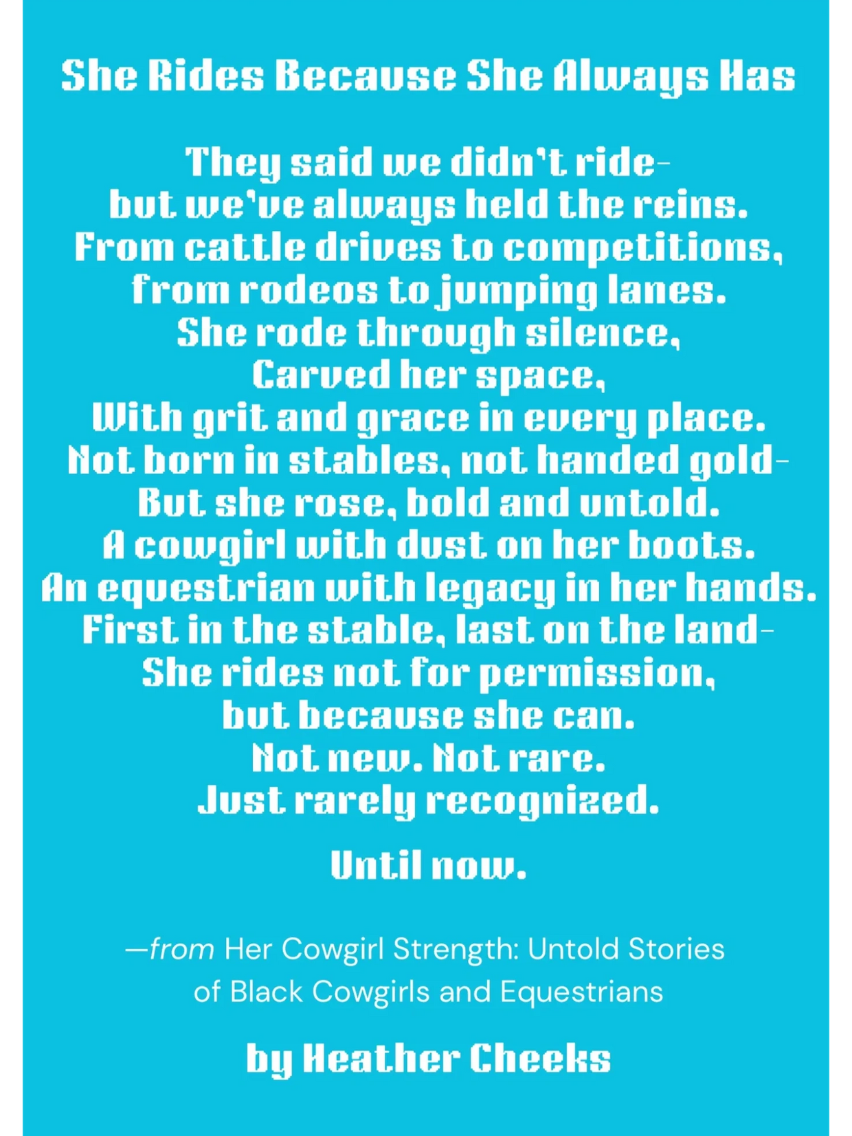 I'm writing the first history book about Black cowgirls and equestrians, documenting their experiences, accomplishments, and the barriers that have broken in various fields and events. Preserving this history is essential, not only to honor their contributions but also to inspire younger generations. By sharing this information, I hope to highlight the opportunities available in the horse world, from competitions to careers.